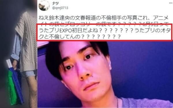 ねえ鈴木達央の文春報道の不倫相手の写真これ、アニメイトの袋とブロッコリーの袋です?6月5日ってうたプリEXPO初日だよね?うたプリのオタクと不倫してんの?